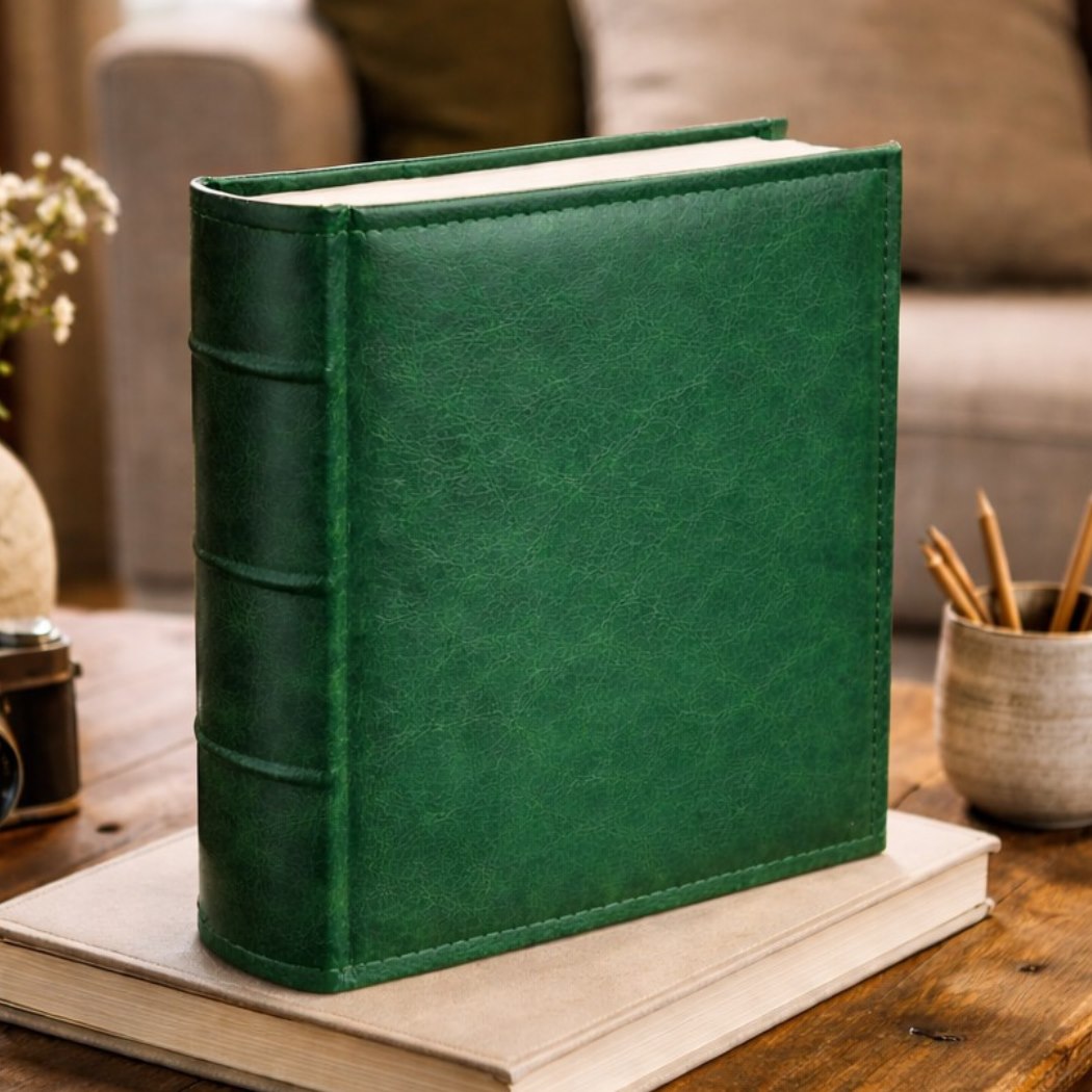 Элегантный фотоальбом в обложке из искусственной кожи зеленого цвета.