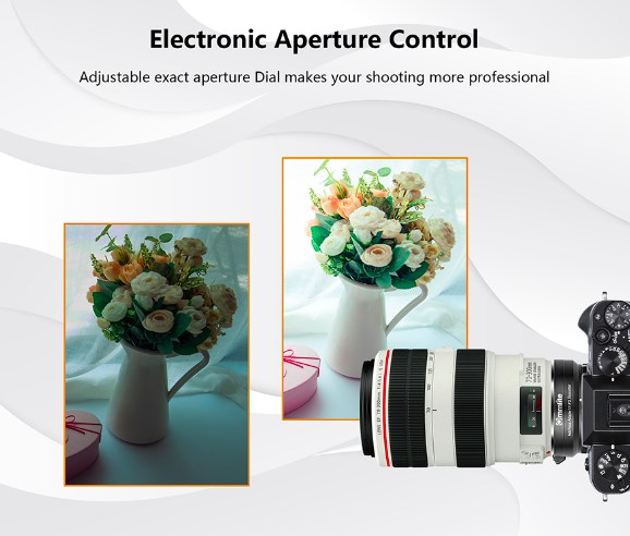 Збільшення Aperture Commlite CM-EF-EOSM Booster дозволяє збільшити одну діафрагму діафрагми, щоб розмити фон і краще виділити тему. Підтримка електронного управління діафрагмою, ви можете регулювати діафрагму об'єктива EF на корпусі камери управління.