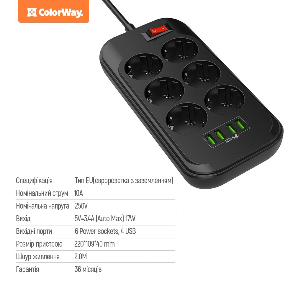 Подовжувач, з шістьма розетками 220В і 4 USB портами 5В. З його допомогою можна підключати не тільки електроприлади, а й одночасно заряджати до 4 мобільних пристроїв.