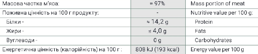 Склад: м'ясо курки не менше ніж 97,4% (закладка сировини до стерилізації), морква столова, сіль кухонна, перець чорний, карі, лист лавровий сухий.