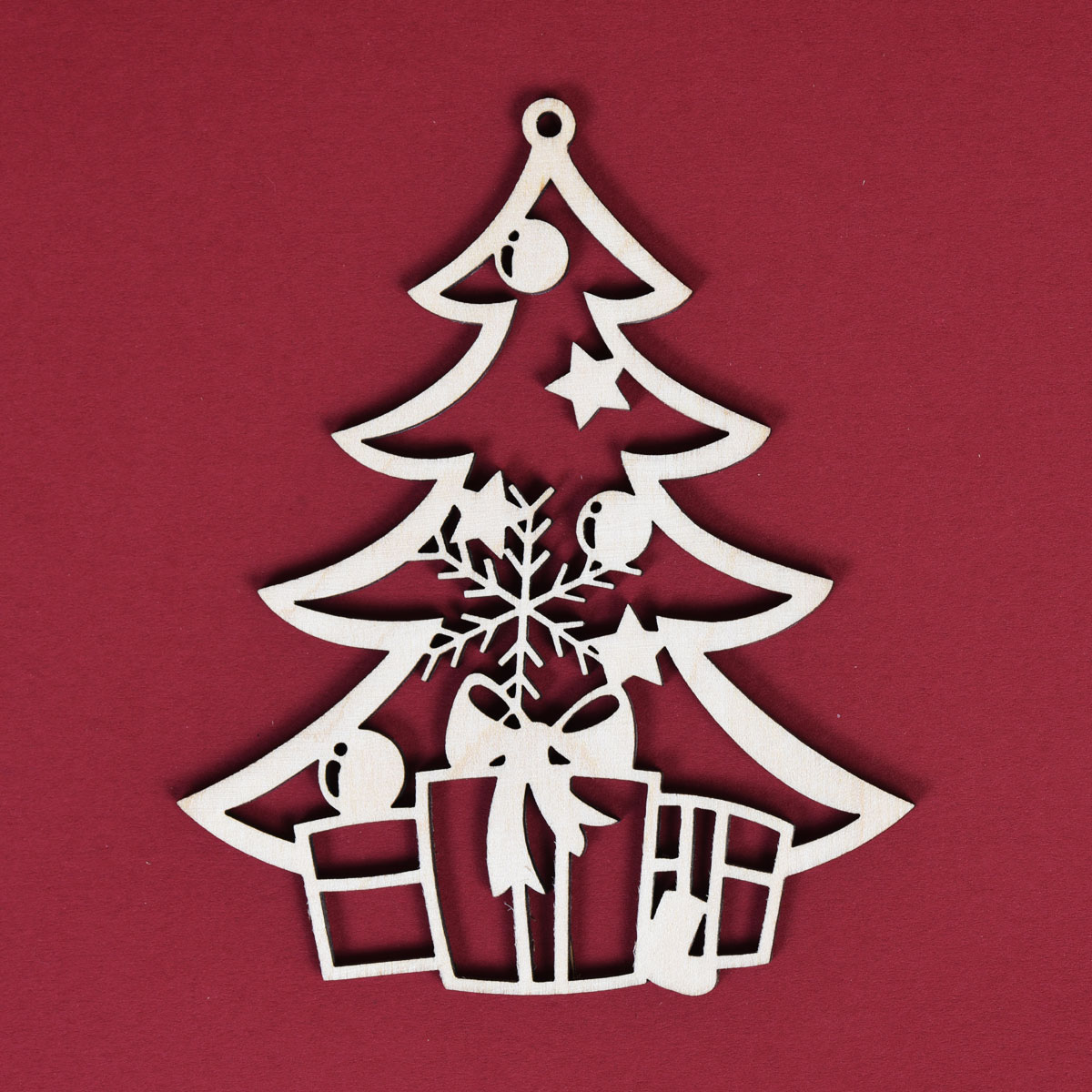 Дерев'яна підвісна іграшка - Новорічна ялинка з подарунками (IP-02), нефарбована.