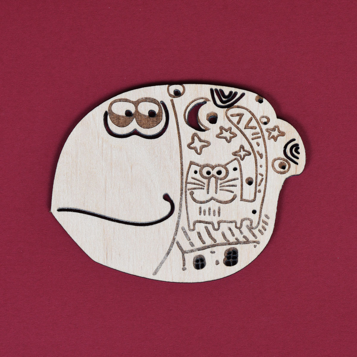 Неабияка ілюстрація кота, який тримає хвіст трубою на фанері в формі рибки. Посмішка риби і загадкові символи на хвості кота здивують вас. Для дітей же такий подарунок буде веселим і неординарним, обов'язково знайде своє місце на новорічній ялинці.