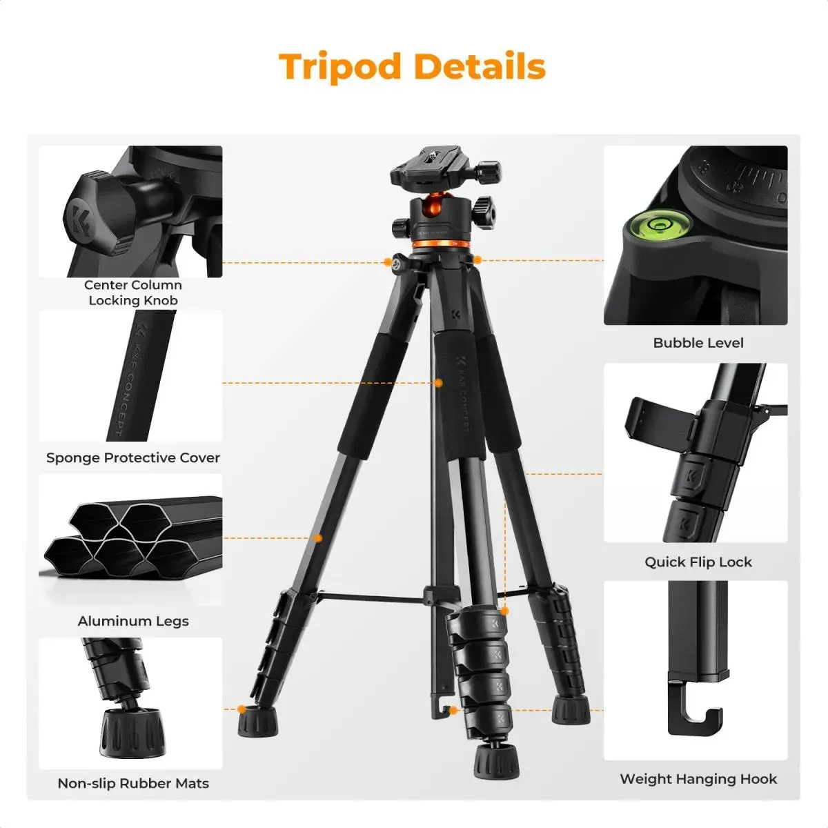 Идеально подходит для фотографии, видеозаписи, потокового вещания и видеоблогинга.оловка штатива выдерживает нагрузку до 8 кг, поддерживает горизонтальное вращение на 360°, регулируемый угол наклона +100°/-70°, быстросъемная площадка позволяет снимать горизонтально, что соответствует требованиям многоракурсной съемки.