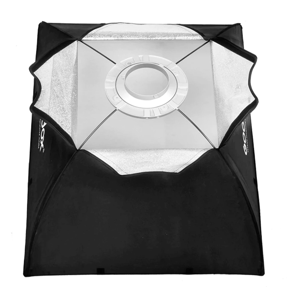 Закрытая конструкция исключает паразитные блики и потери светового потока. Отражающая серебристая поверхность обеспечивает равномерное распределение света внутри софтбокса, а белые полупрозрачные тканевые рассеиватели делают свет более мягким.