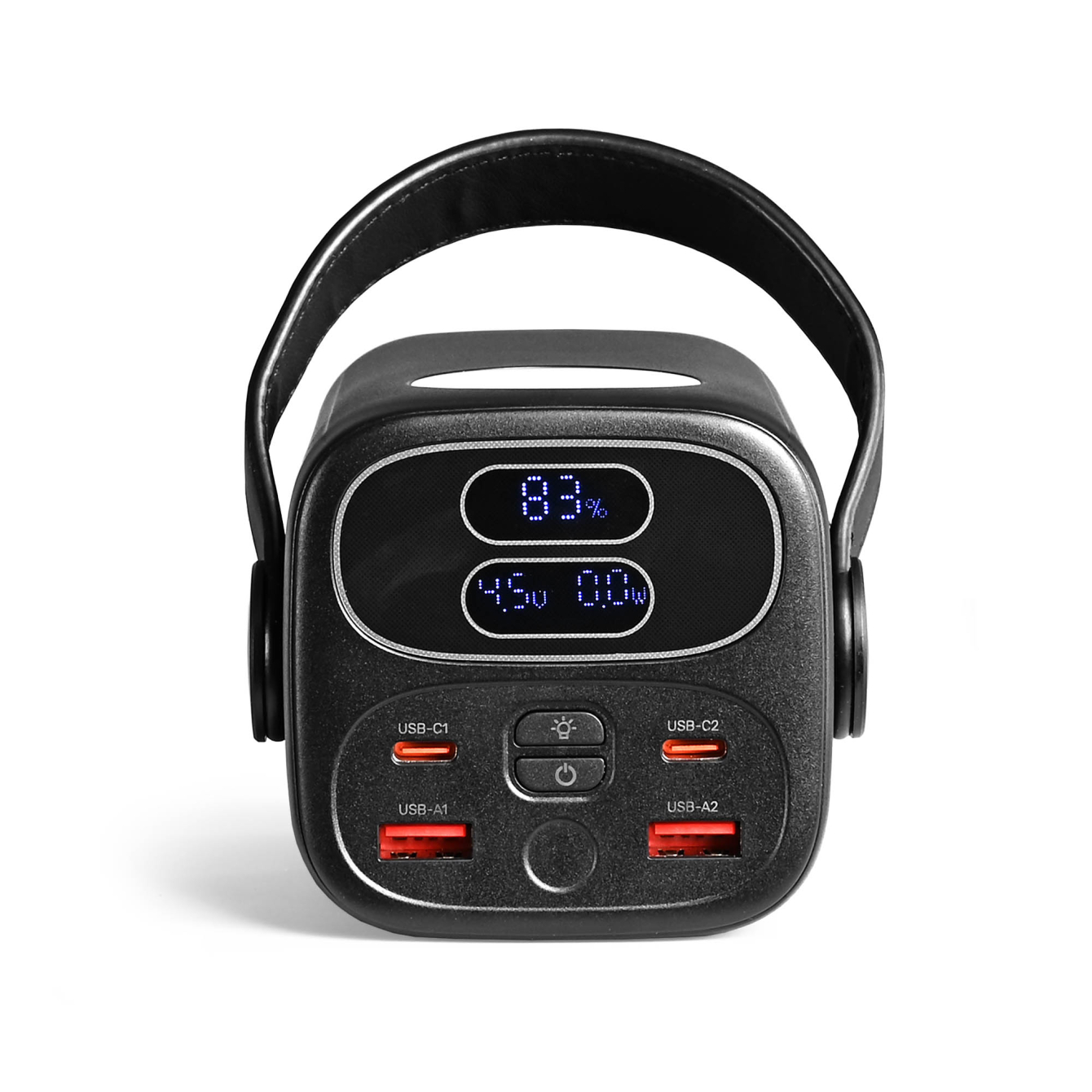 Повербанк TITANUM TPB-WC40-B имеет емкость 40000mah и максимальную выходную мощность PD65W. Этот аккумулятор оснащен литий-полимерной батареей 3.7 V, 148wh, что позволяет заряжать телефоны, планшеты, смарт-часы, ноутбуки благодаря поддержке технологии Power Delivery (PD). Повербанк имеет встроенную LED-лампу, расположенную на лицевой части корпуса, которая может использоваться в качестве подсветки. Для активации подсветки достаточно зажать на 2 секунды соответствующую кнопку на корпусе повербанка. Повербанк имеет встроенный LED-экран, который при нажатии на кнопку питания отображает уровень заряда, напряжение и мощность в текущий момент. Дополнительным преимуществом данной модели является оснащение ее ручкой, что облегчает процесс транспортировки изделия. Размеры изделия – 143х85х75мм, вес-945г.