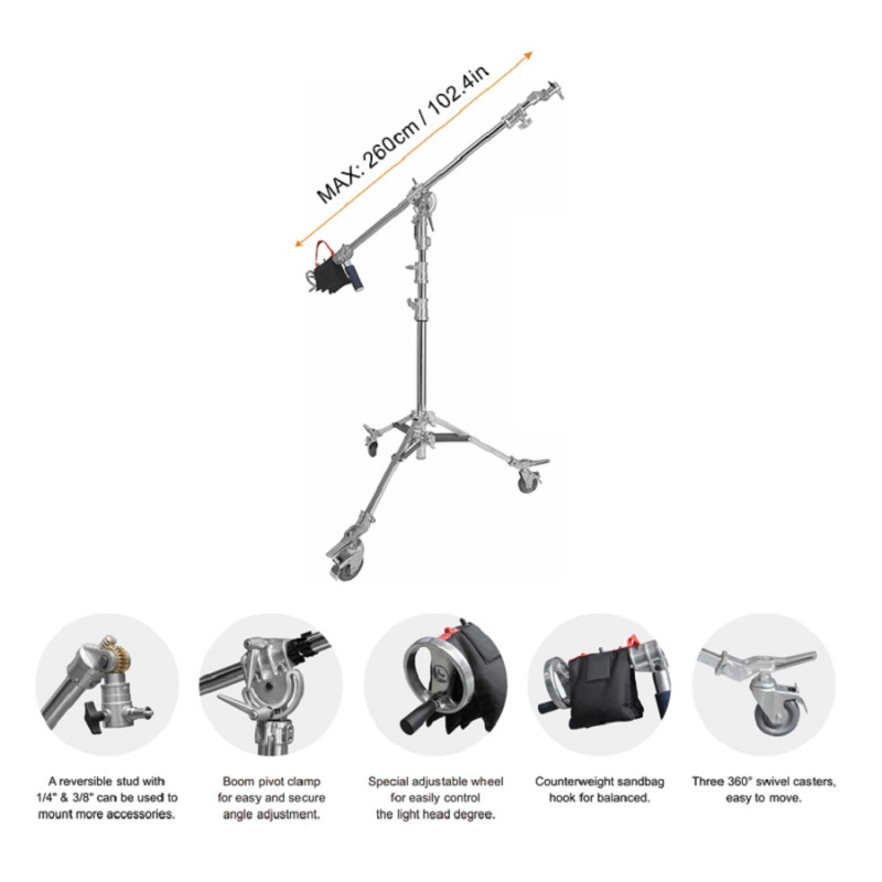 Стальная стрела длиной 260 см снабжена удобной ручкой, которая упрощает регулировку положения. Максимальная рабочая высота журавля составляет 226 см, а грузоподъёмность — до 5 кг. Идеально подойдёт для студийного света, микрофонов, небольших приборов.
